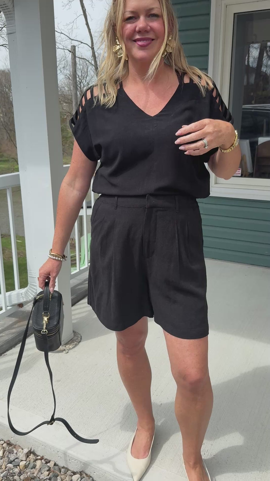 A classic trouser short in black goes a long ways. Dress it up with a blouse or blazer or down with your favourite tank for a style that can go from day to evening with ease. Featuring a stretch elastic back and a wide, flowy leg with a 6" inseam, this short is comfortable and light; a summer classic.