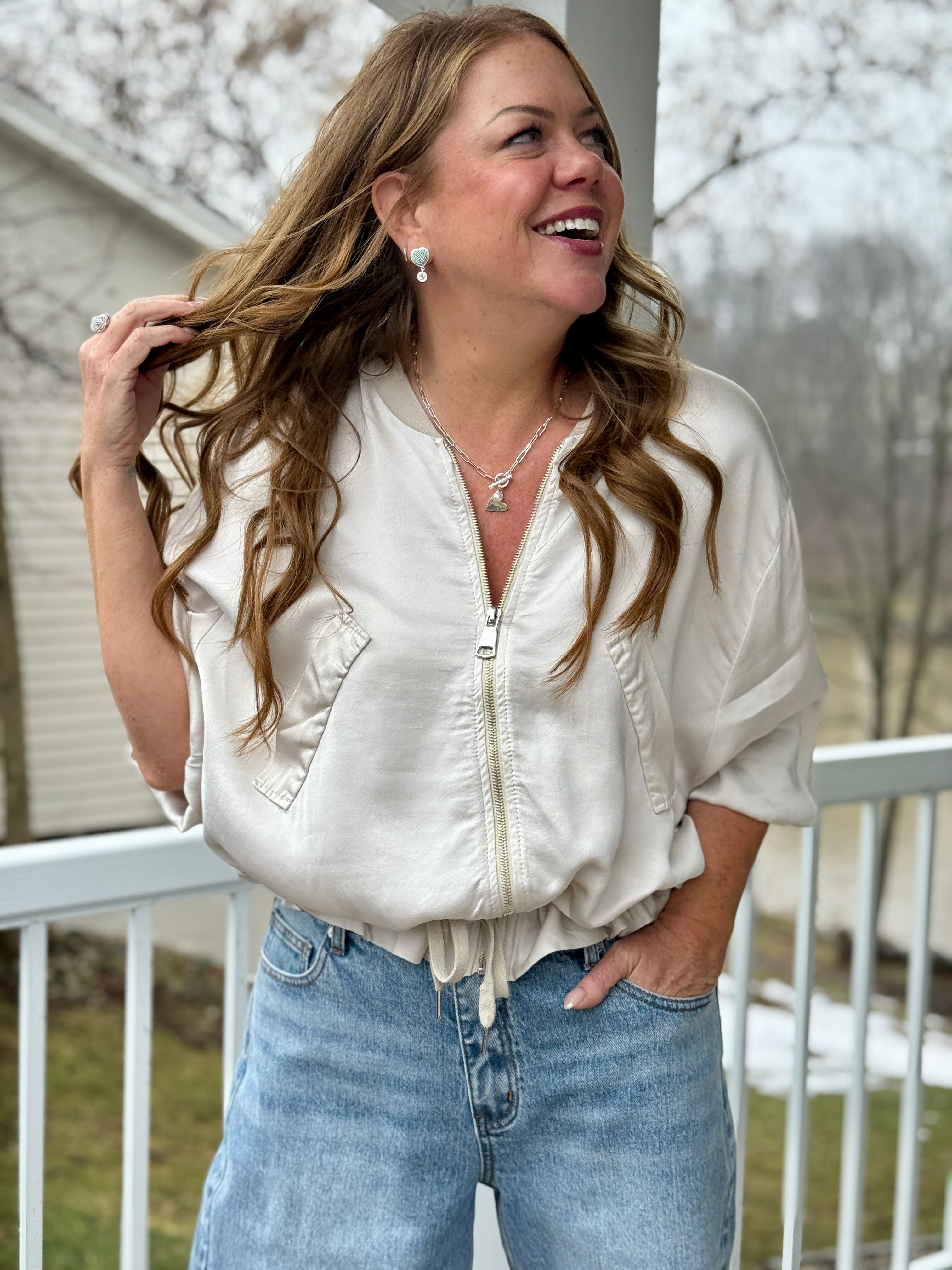 Wear it zipped as a blouse with denim or tailored trousers, or leave it open as a soft little jacket layered over a tee or silk cami. It’s the kind of versatile piece that instantly makes an outfit feel polished, without ever trying too hard.