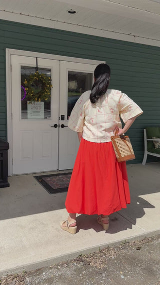 The stunning fiery orange Costabile maxi skirt is all about volume, ease, and a little bit of drama. This long balloon-style skirt is designed with a softly ruched elastic hem that gives it that beautiful, floaty shape. The wide waistband with side ruching creates a flattering, comfortable fit, while the handy side pockets keep it practical enough for everyday wear—because we believe style should always come with pockets. Wear it as a set with the Nunzio Top for a bold tomato red moment, or mix it back with the Santiano Tee or any fun summer top in your wardrobe. Easy, breezy, and made to move with you from coffee runs to cocktails.
