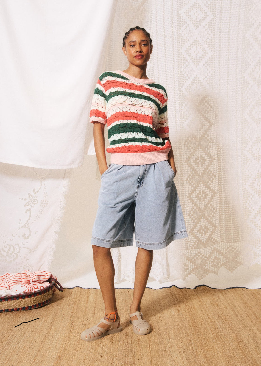 The Gelsomina Crochet Top by FRNCH is basically a Paloma in outfit form… fresh, fun, and impossible not to love. Ultra soft with an easy pullover fit, this crocheted tee brings all the texture of trending, beautiful crochet without any fuss. The classic crew neck and ribbed hem keep it grounded, while the mix of coral, watermelon, green, and blush does all the talking. It’s cheerful, a little retro, and very good for your mood. Throw it on with denim or your favourite shorts and you’re instantly pulled together, no overthinking required. Bright, breezy, and just the right amount of playful; cheers to that.
