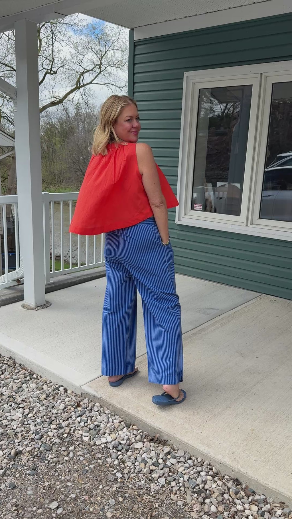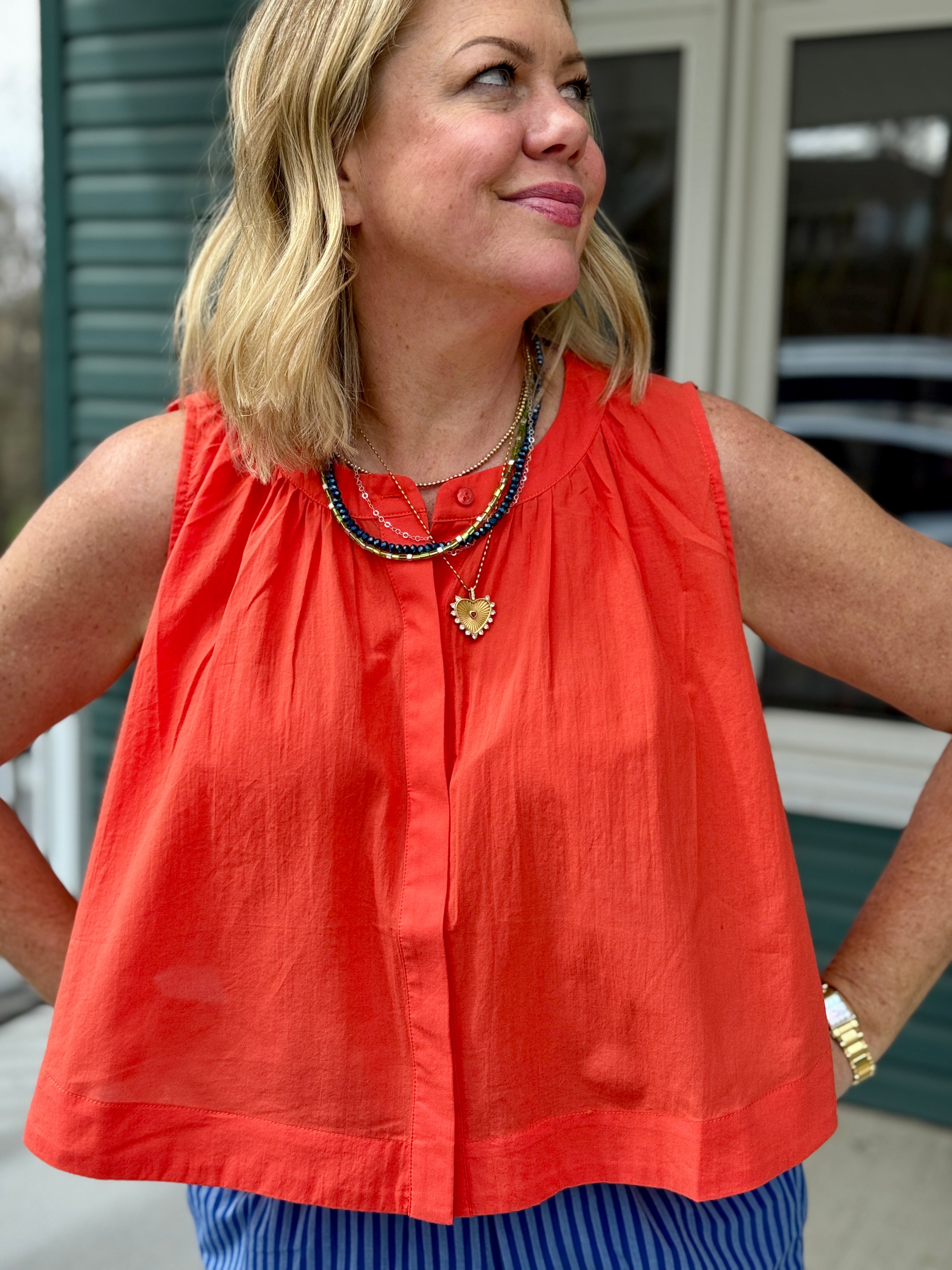 In firey summer orange Nunzio by FRNCH is bold, fresh, and guaranteed to wake up your whole outfit. This loose, sleeveless style features a softly rounded neckline with delicate ruching for just a touch of texture, plus a hidden button closure to keep the look clean and polished. It’s easy, breezy, and made for those warm days when you want to look put together without overthinking it. Pair it with the matching Costabile Skirt for a standout set, or style it back to denim, especially jean shorts, for an effortless, throw-on-and-go look. Bright, flattering, and just the right amount of statement.