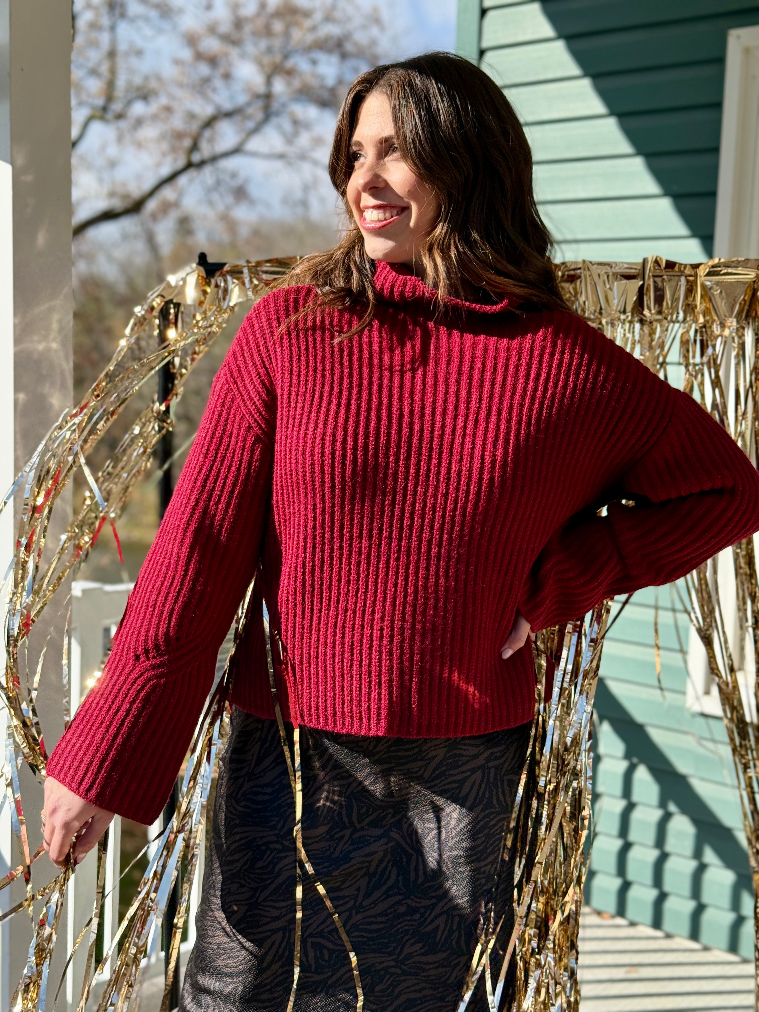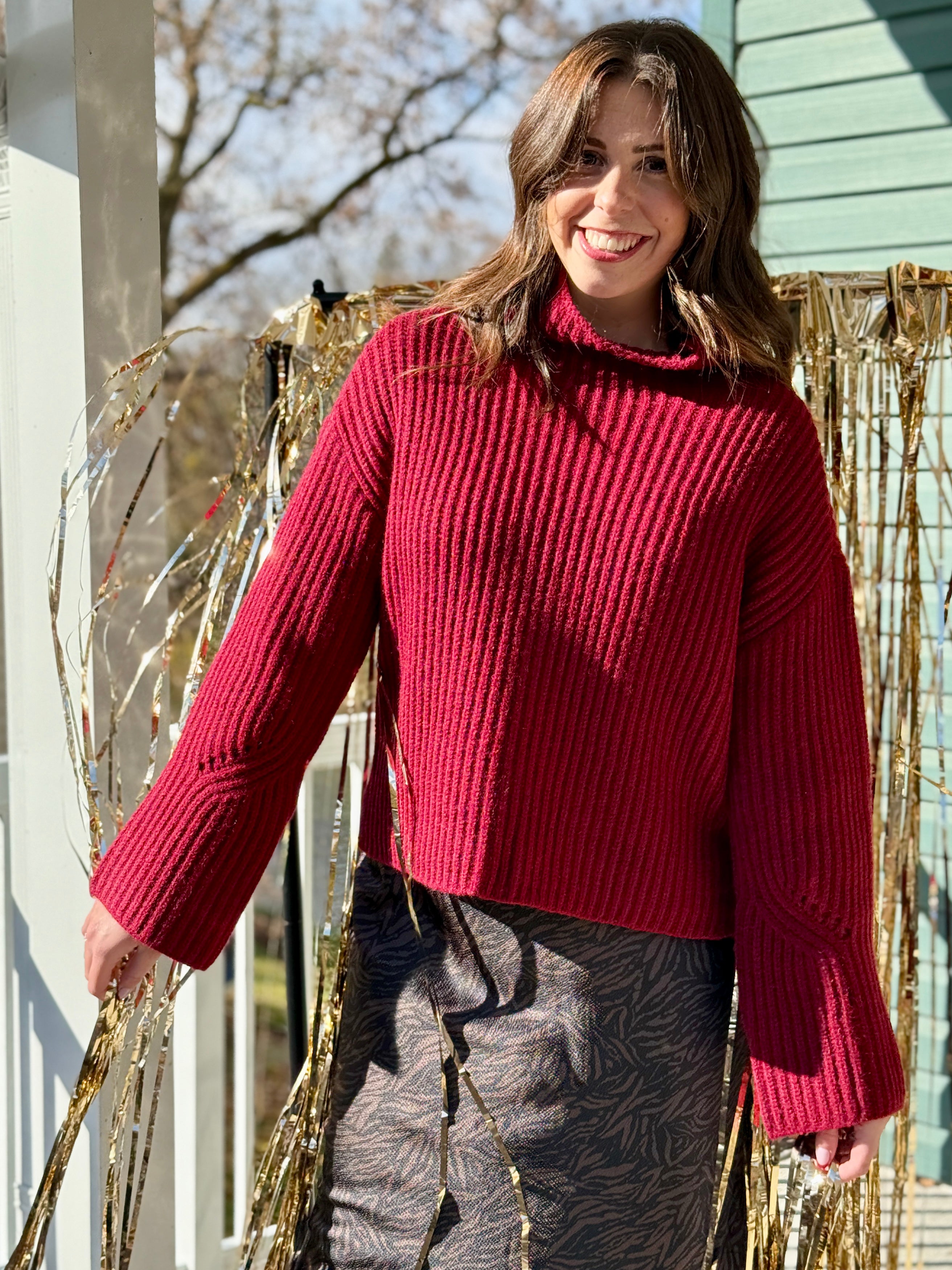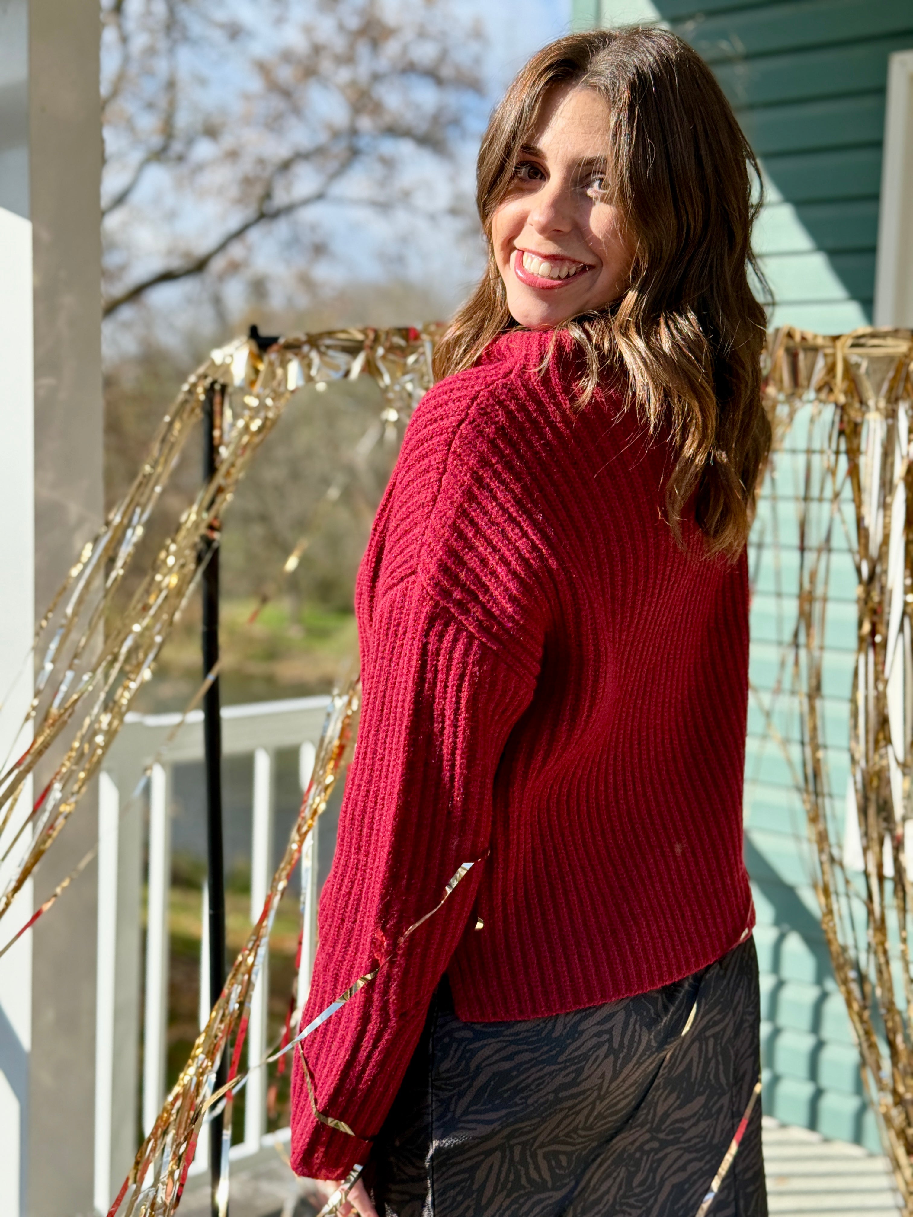 The Marlow sweater is your new reason to love sweater weather. Knit from a cozy yarn in a rich crimson red, it features a full cardigan stitch for texture and warmth, plus delicate pointelle detailing that runs along the sleeves. The neckline? A charming "chimney" neckline, falling somewhere between mock and turtleneck—just the right height to feel polished without feeling stuffy. It’s the kind of sweater that looks effortlessly put-together with jeans, trousers, or over a slip dress or skirt. Classic, cozy, and quietly striking.