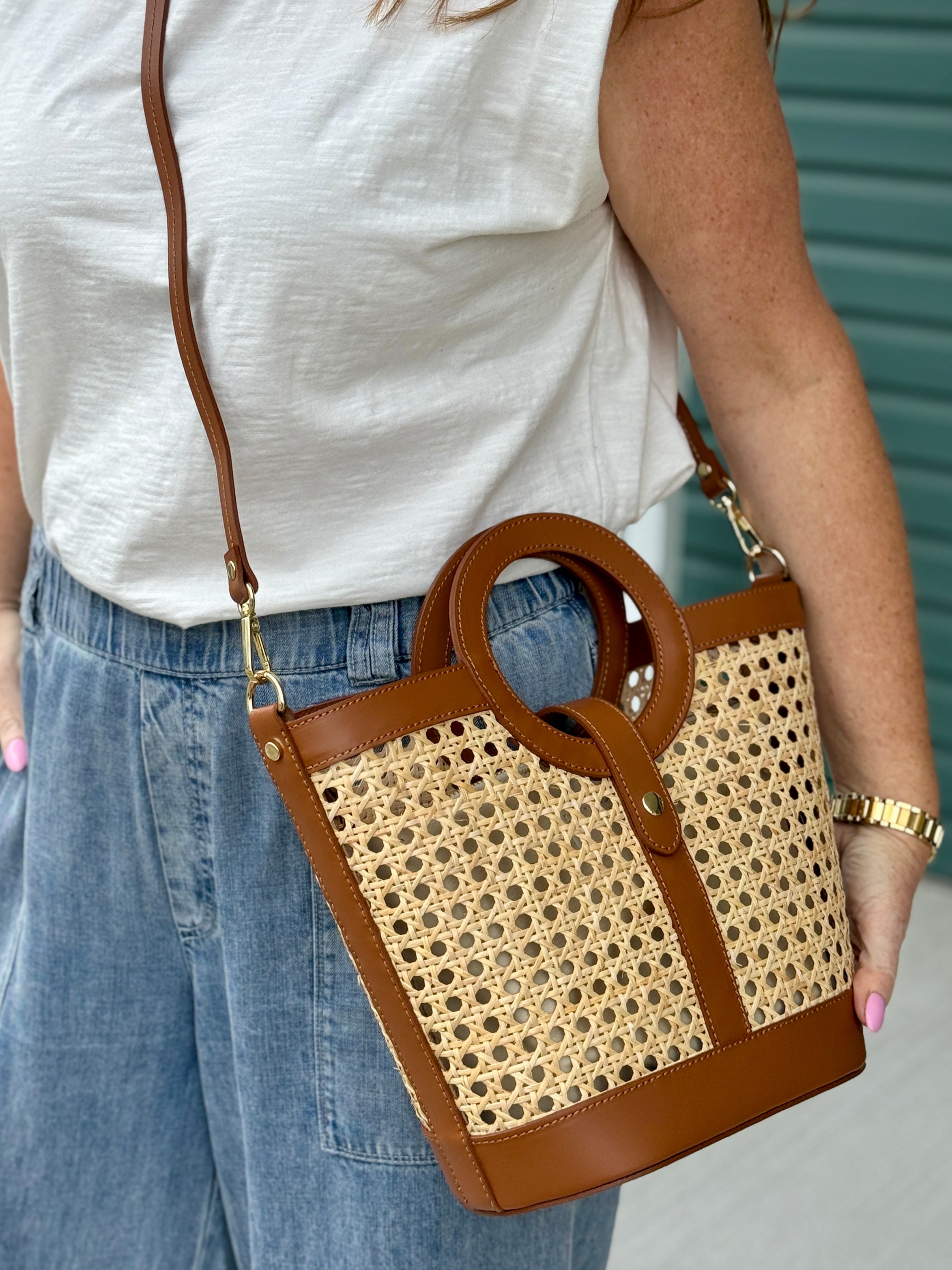 Oh boy. This is an outstanding bag! Featuring an integrated round handle in smooth Italian leather, and caned rattan, the shape and details of this bag are luxe and special. Gold hardware and feet, plus a gold snap closure add shine. The interior canvas pouch can be removed for a more open look, or kept snapped in place. This is summer neutral meets Italian craftsmanship at her best.