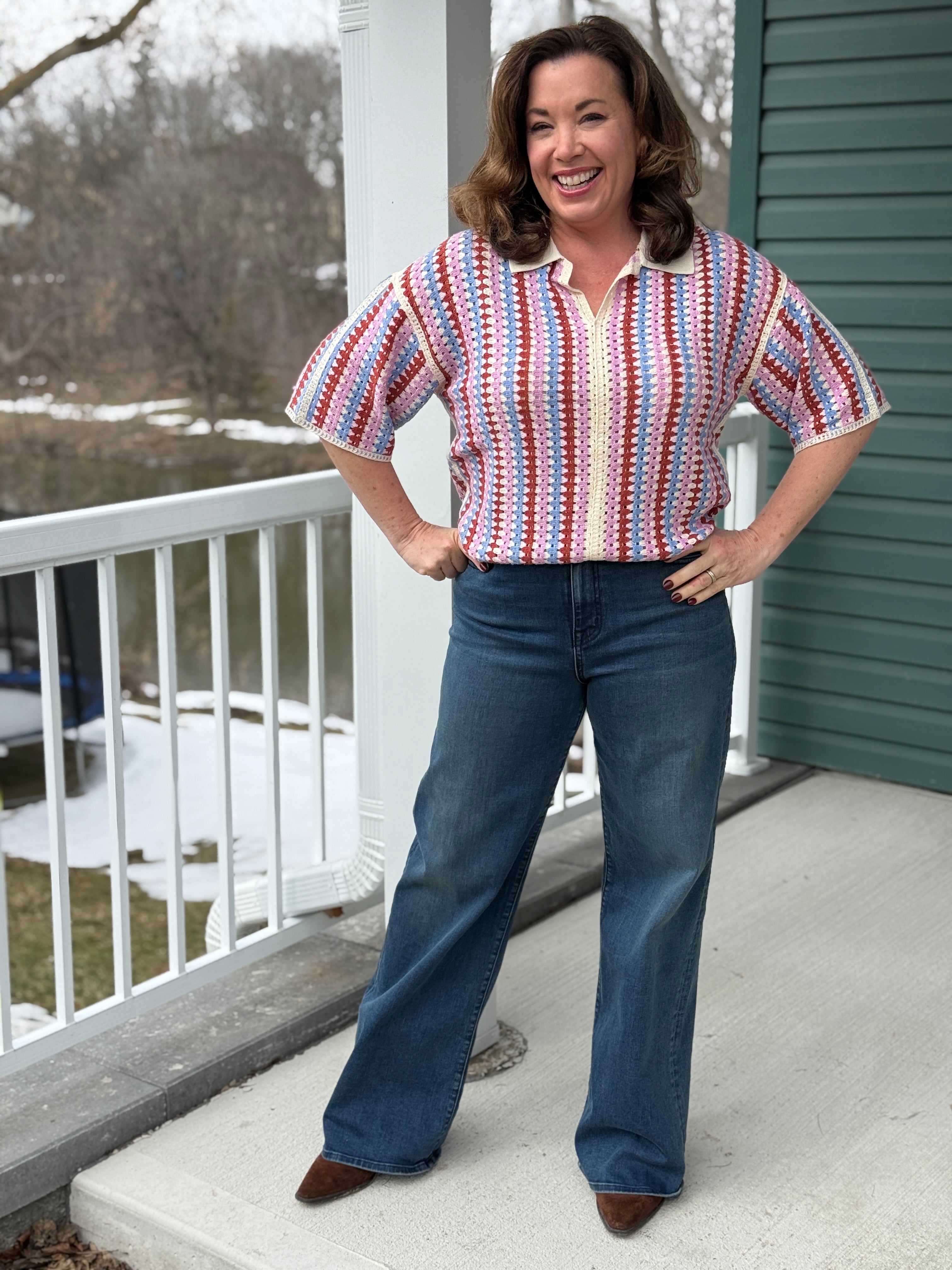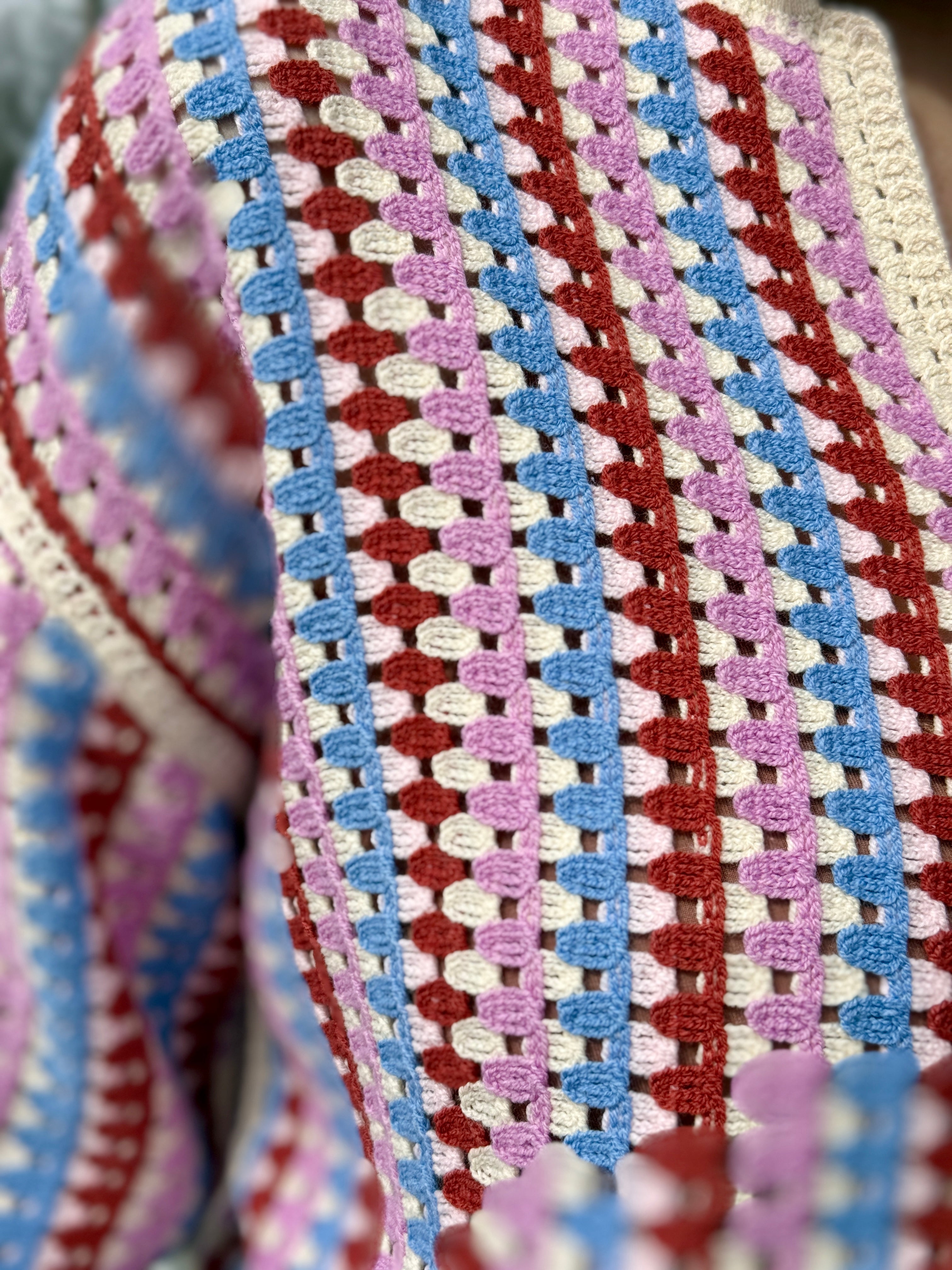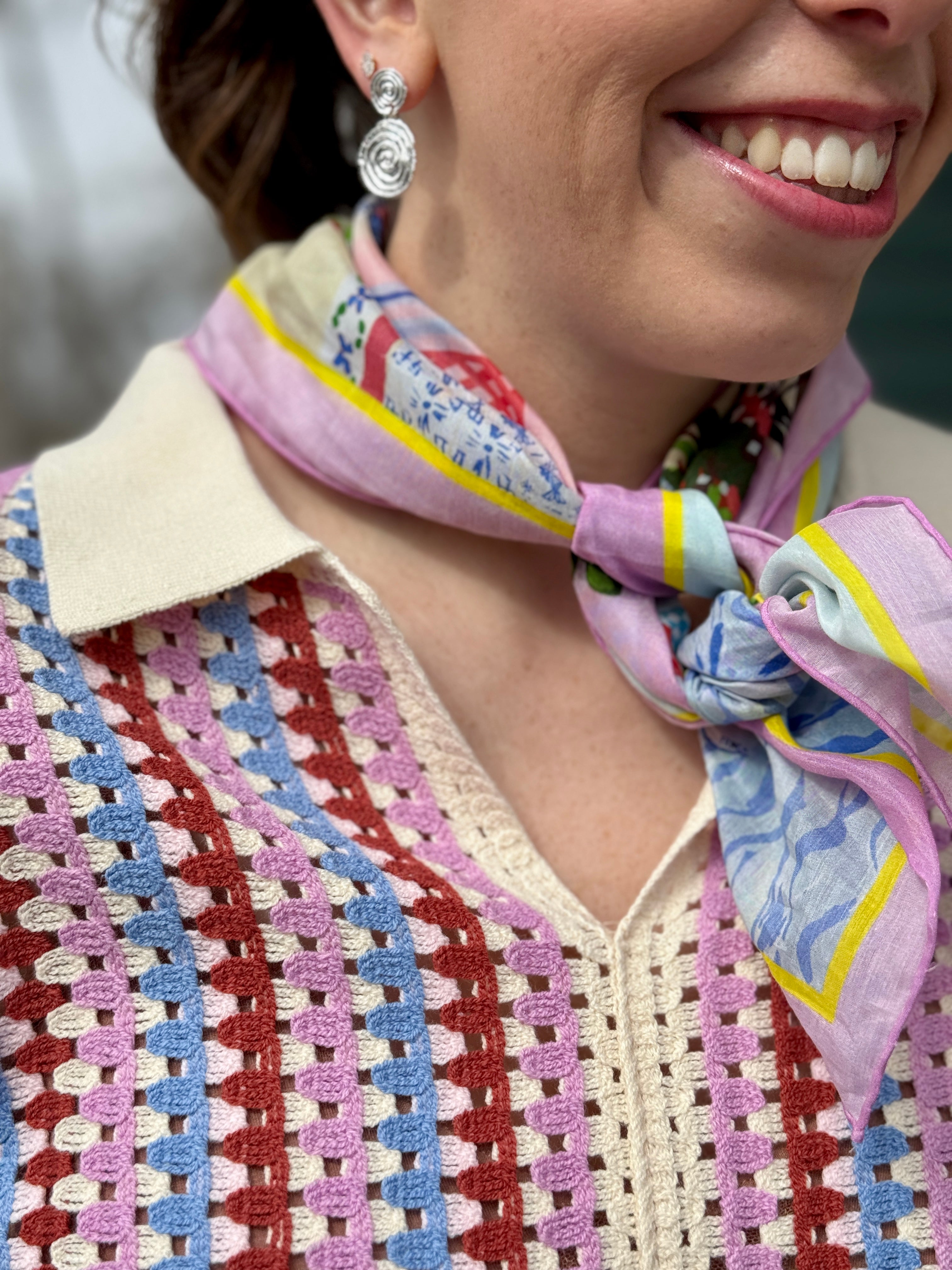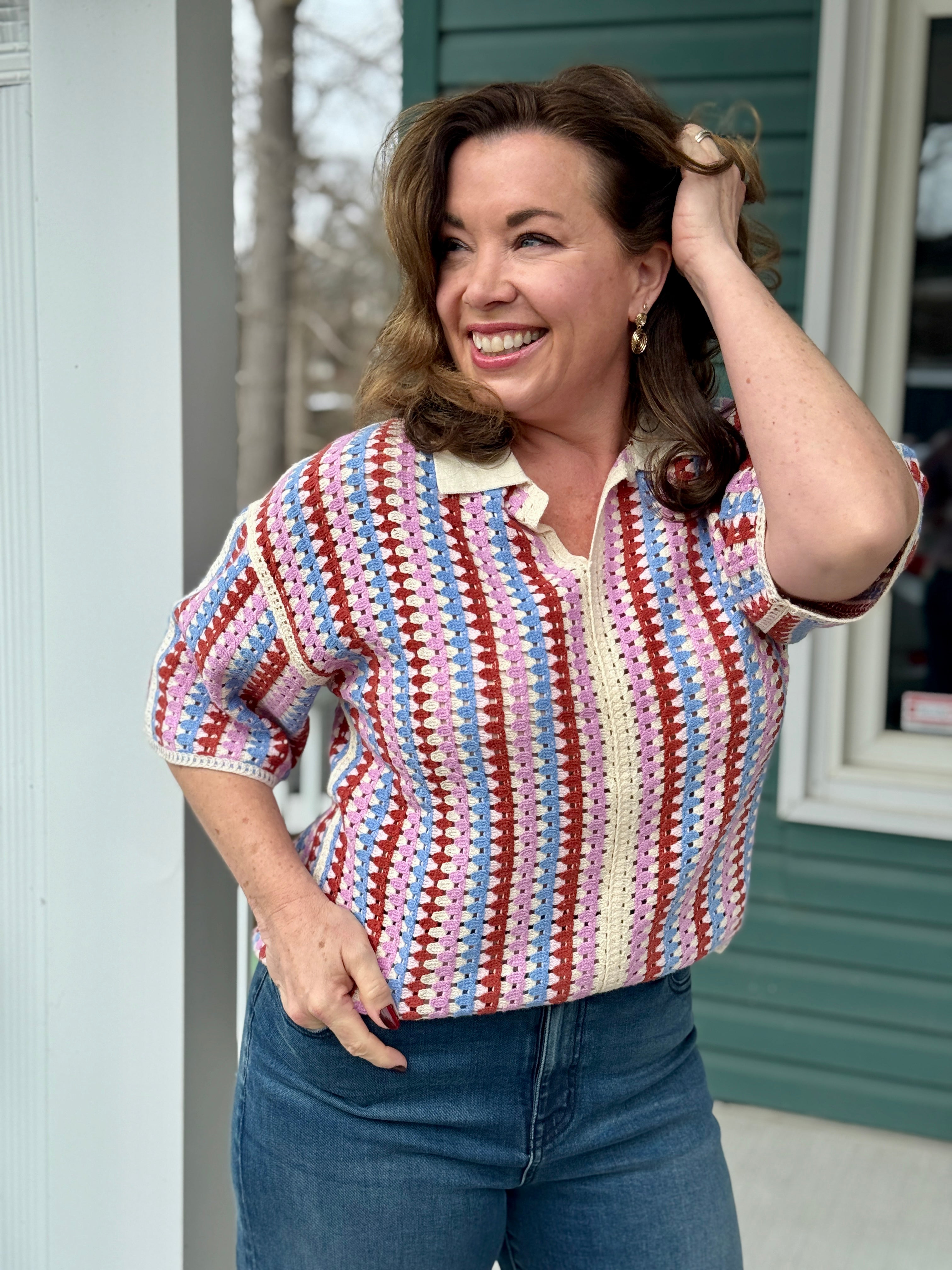 Make it officially spring in this charming crocheted knit top that's equal parts chic and comfy. Featuring an adorable collar and short sleeves, it's the perfect layering piece for transitional weather. Blue, lavender, and rust come together for a slightly retro yet very fresh colour combination and style. Perfect paired back to denim or the many Spring. bottoms to come, this is an early Spring standout indeed with a little French flair.