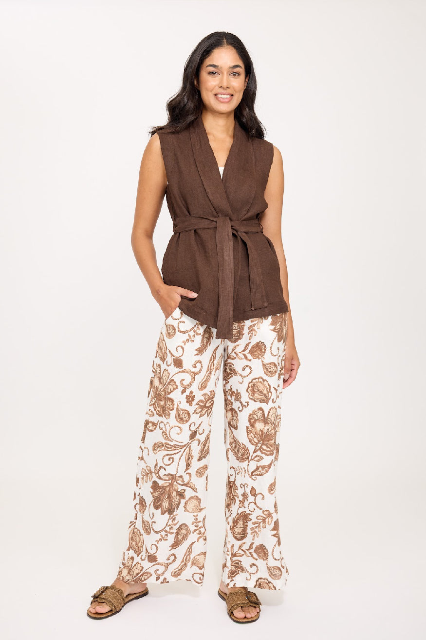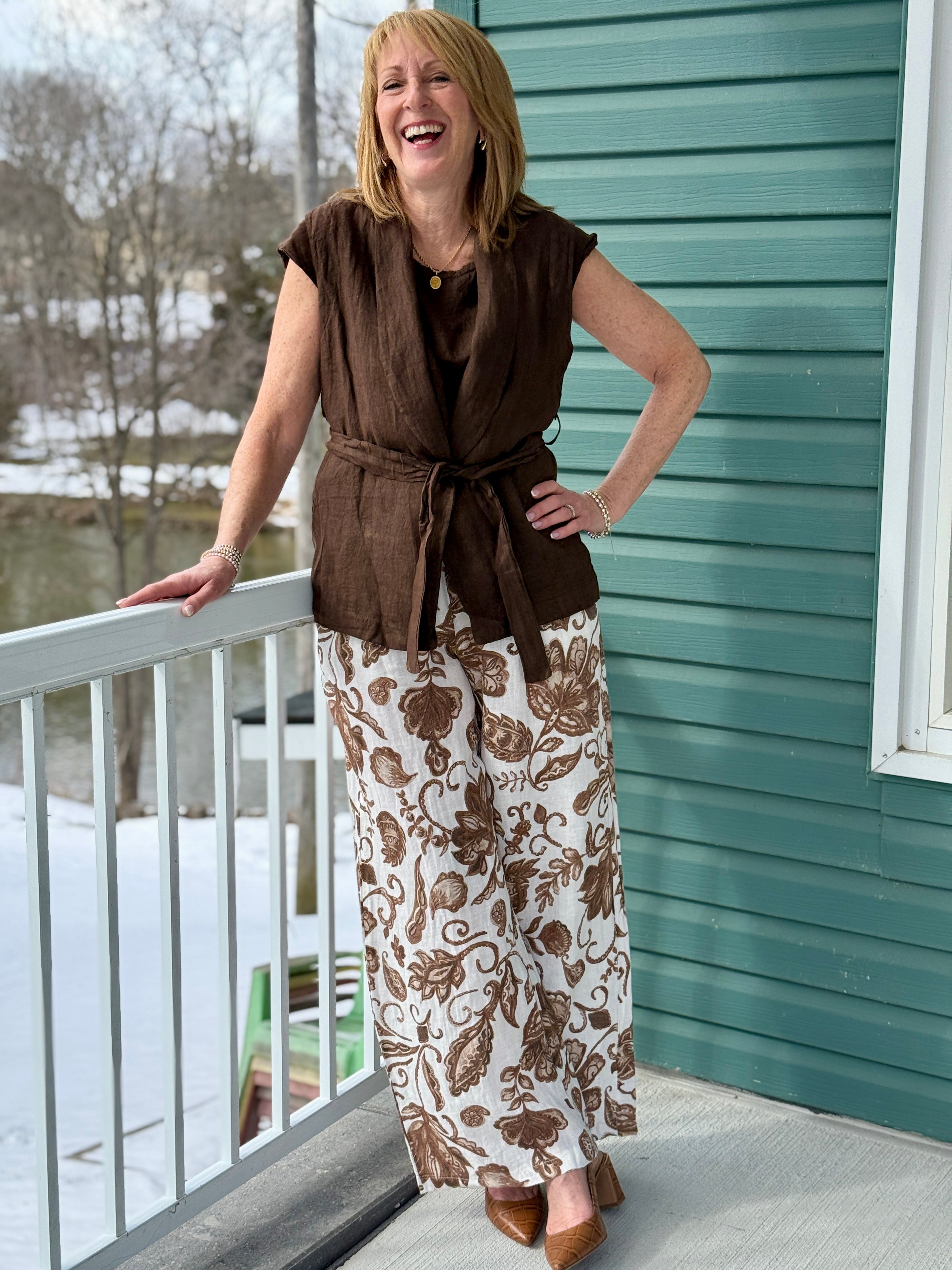 The layering hero of Café Society. This thigh-length, sleeveless wrap vest features a dramatic shawl collar and a removable belt so you can wear it open as a vest layer, or cinched and styled as a top. In rich coffee brown, it instantly elevates denim, sharpens up a tee, and layers seamlessly over the coordinating Pistache paisley pant for a head-to-toe moment. It’s that piece that makes people ask, “Where did you get that?”